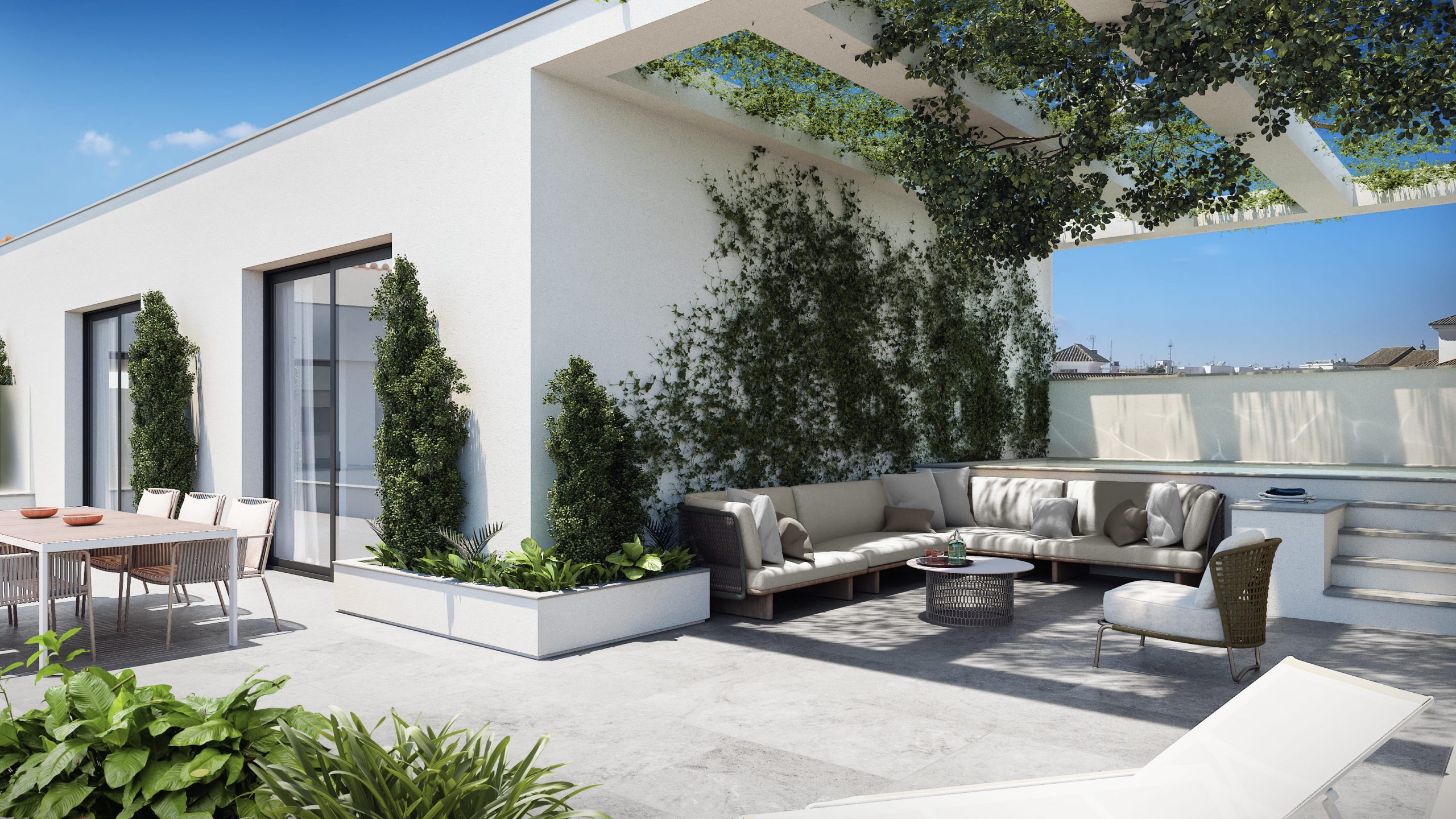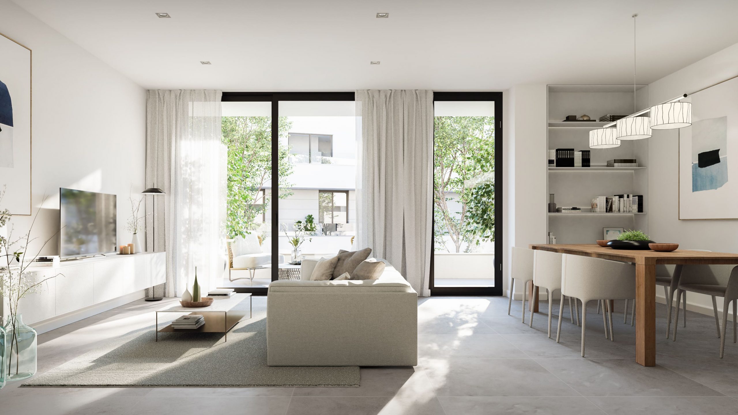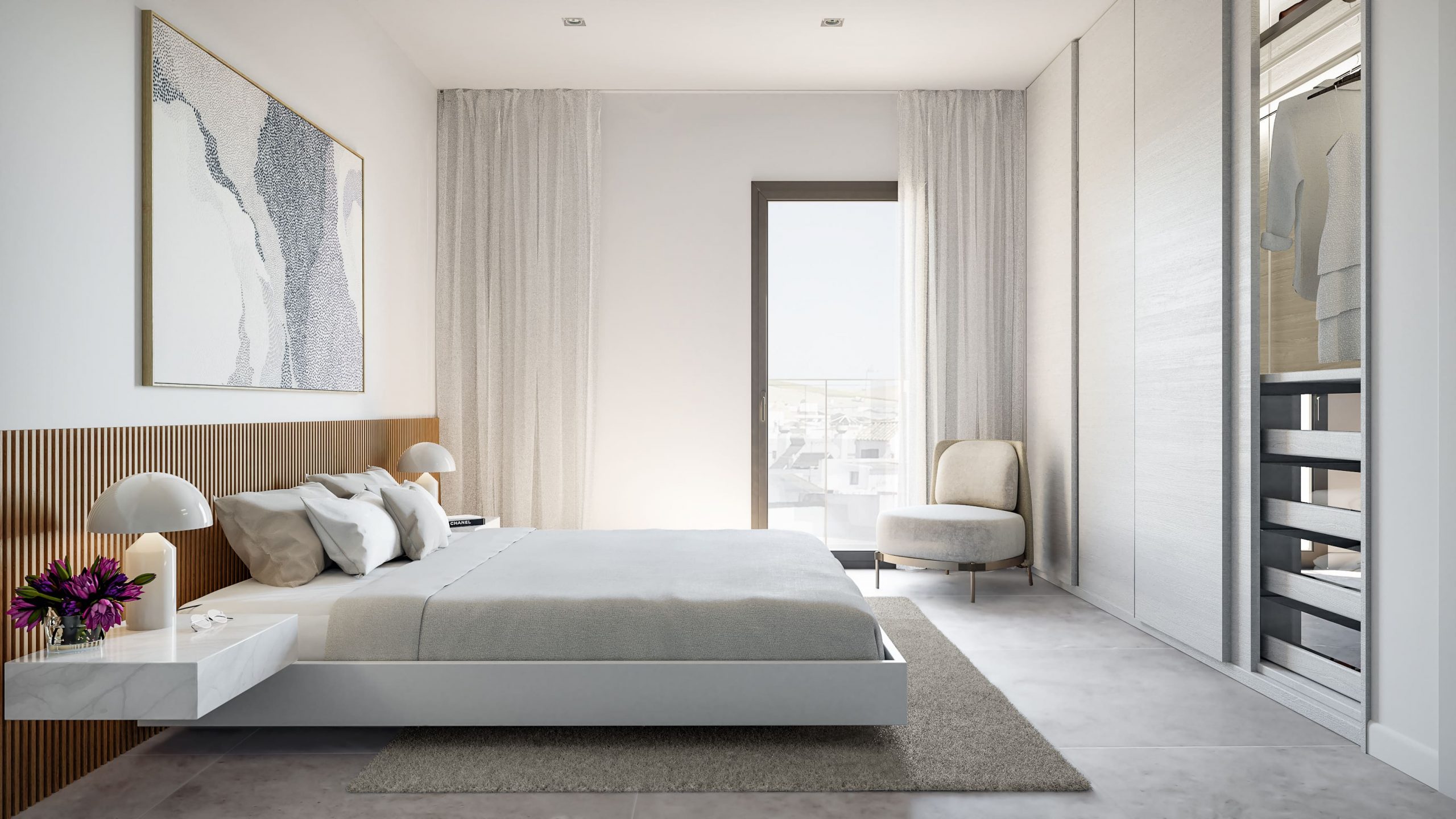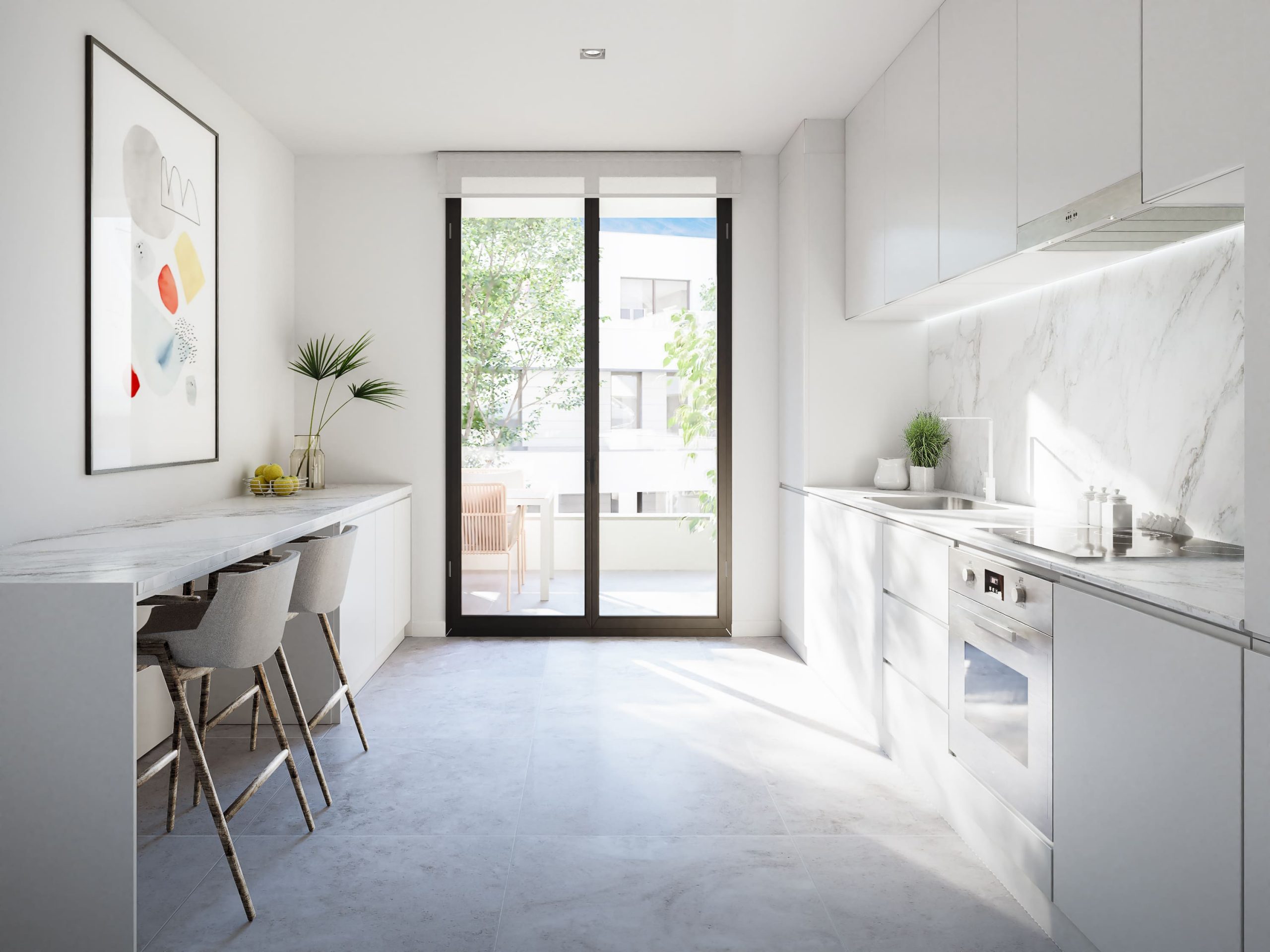 Se nos encargó el desarrollo de un reportaje integral de imágenes del proyecto para su posterior comercialización, de ahí que optásemos por un estilo novedoso y fresco, donde desarrollamos variantes de la rehabilitación de la fachada que había que respetar, ambientación de los espacios comunes y el desarrollo integral de una de las tipologías más representativa del conjunto residencia, donde desarrollamos el diseño interior.